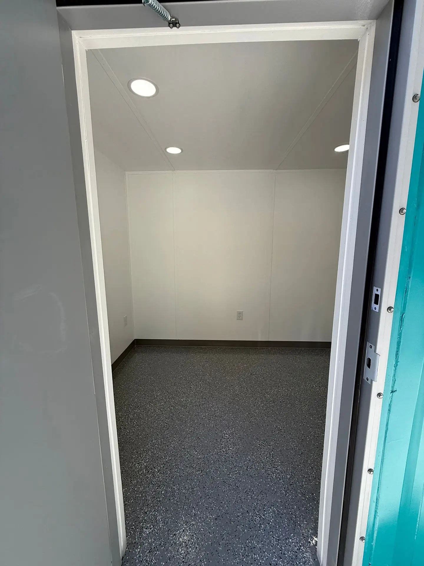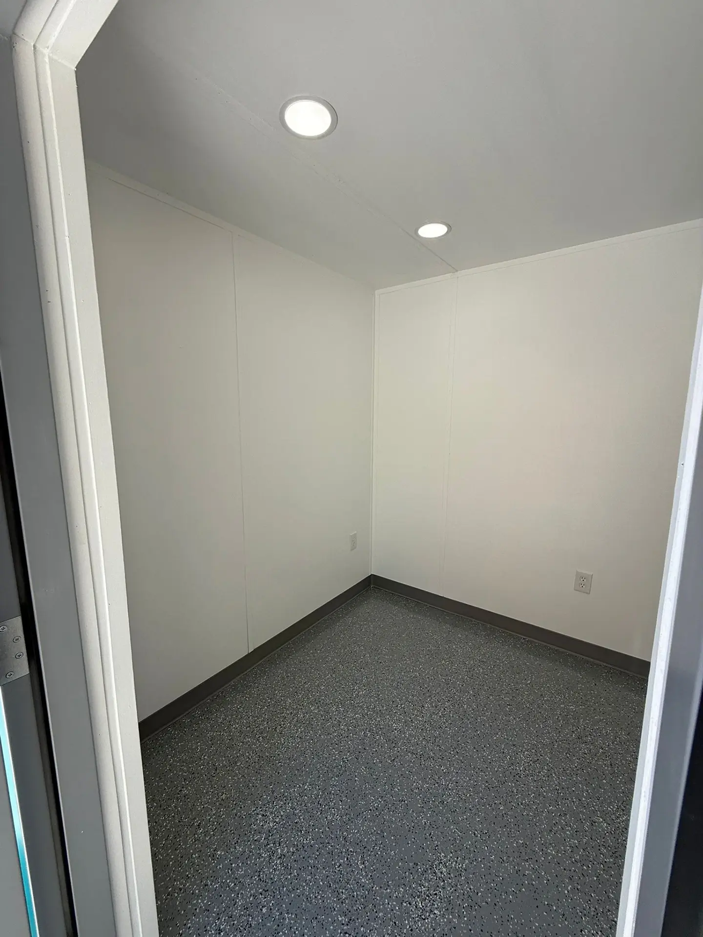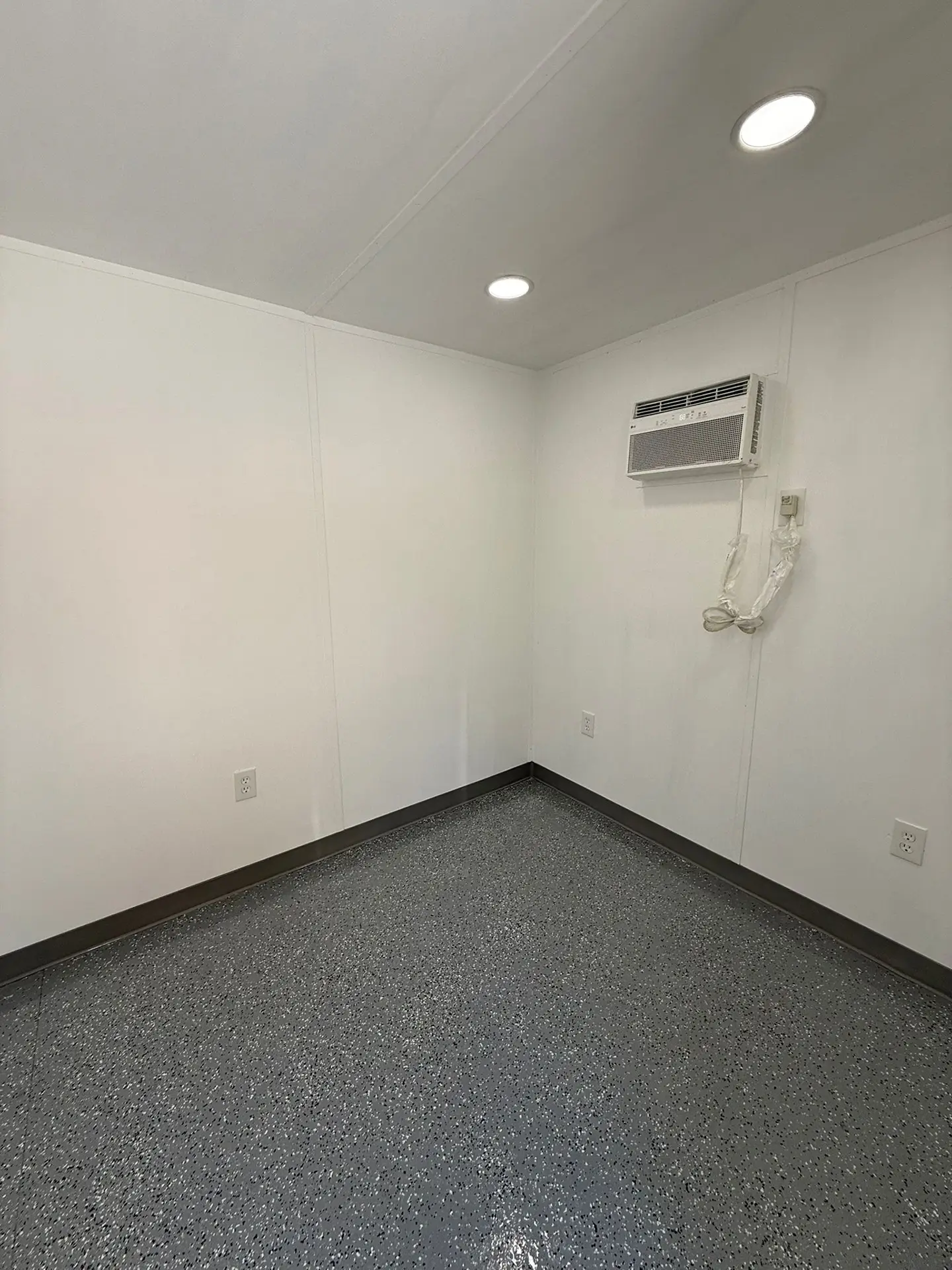Our 20’ Combo Office is equipped with electrical outlets mounted on the interior wall, ceiling light, air conditioner, ventilation, and clean white walls with light.